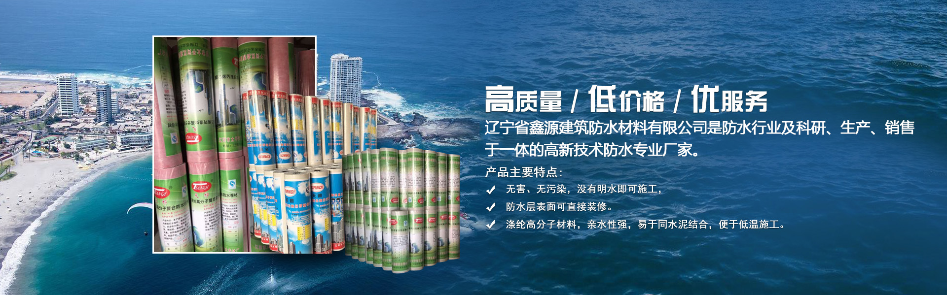 遼寧省鑫源建筑防水材料有限公司,是防水行業(yè)集科研、生產(chǎn),銷(xiāo)售于一體的高新技術(shù)防水專(zhuān)業(yè)廠(chǎng)家,是近幾年升起在防水行業(yè)的一顆新星。 企業(yè)擁有國(guó)內(nèi)大型一次成型高分子聚乙烯、丙綸、滌綸、復(fù)合防水材料生產(chǎn)線(xiàn)多條。 企業(yè)技術(shù)力量雄厚,專(zhuān)業(yè)技術(shù)人員云集,檢測(cè)
